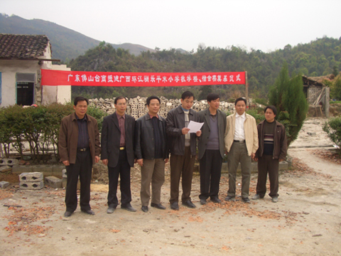 该工程投资43万,兴建1栋402平方米的教学楼和1栋328平方米的师生宿舍楼,定于六月前完工,确保下学期正式交付使用,台商联谊会委托禅城区驻环江县的两位支教老师负责学校建设的质量监督。平末小学位于边远山区,交通十分不便,一下雨就难以通车。为了赶在雨季到来之前备好料,我们在春节期间就努力做好了图纸设计等前期准备工作,并于春节前就把12万元启动资金汇到了施工单位环江联达建筑工程有限公司。在开工仪式上,驯乐苗族乡领导和校长对台商的捐资表示衷心的感谢,并表态一定要联系当地群众积极支持学校的建设,建筑公司覃经理表示一定如期优质地建好希望小学,不能辜负好人们对他们家乡的深情厚意!