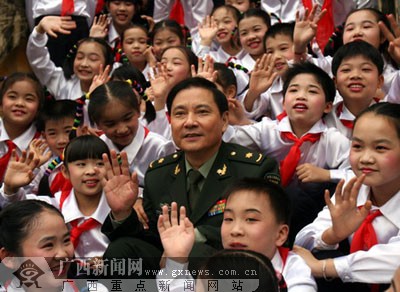 特型演员卢奇受到少先队员们的欢迎。梁凯昌摄