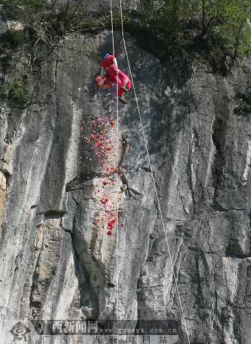 在今天举行的开幕式表演中,来自国内攀岩俱乐部的女性队员身着仙女彩装从180米高的凤阳关山巅速降而下,在半空中还抛洒出漫天的玫瑰花瓣,演绎了一出精彩的天女散花。