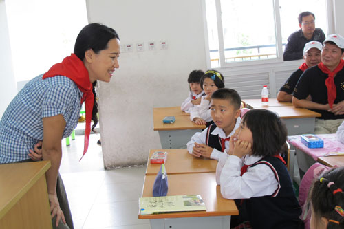 崔雁和朱玉梅老师为灾区孩子们带来了特别的课程——“环保伞制作”、“爱心T恤设计”双语课程,其中融合了英语、美术、制作、环保等诸多知识与内容,一个课堂两位老师多种知识,让当地老师也大开眼界。