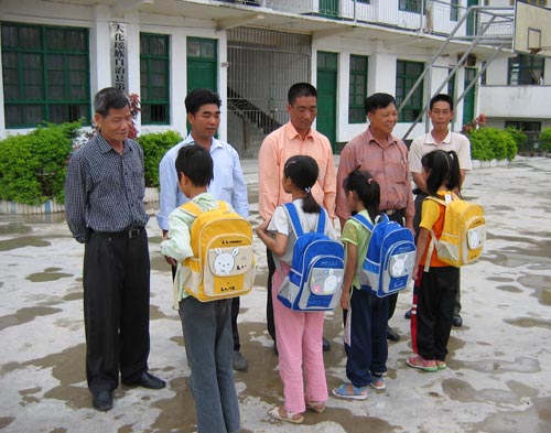 寒假一结束,我回到广西立即展开了调查的工作,经过走访核实,我找到了四个家庭贫困的优秀女生,分别是大化二小三年级的蒙玲玲和韦柳鸿以及四年级的卢蒙霏和唐溢谦。4月10号陪同广西领导到广东考察的时候,我专程拜访了邓书记,把这四个女生的情况告诉了他,邓书记看完了她们的资料,二话没说就把她们四人现在到六年级的学习费——2000元全给了我,让我帮她们存放好,还叮嘱我钱不够了就告诉他。朴实的话语让我心头一热,他们之间可是素未谋面的呢,邓书记有的仅仅是一颗善良的心吗?不!还让我真真切切地感受到一个共产党员无私奉献的高尚情操哪!“5、1”假前夕,邓书记又特地给我打来了电话,说想趁假期过去探望一下小同学。言出必行是邓书记向来的作风,5月2日我们搭乘大汽车向广西河池大化进发了,同行的还有村委会的一些领导以及石湖洲小学的两个老师和一个同学代表。当天晚上,邓书记又亲自掏钱为受资助的小同学每人买了些文具和书籍。5月3日,邓书记一行来到了大化二小,在校长办公室里,邓书记和受资助的小同学见了面,邓书记亲切地向她们询问了生活以及学习方面的情况,得知她们艰难的家境,邓书记又掏出了钱给她们,村委会的其他领导也纷纷慷慨解囊,给小女生们送上了慰问金。之后,邓书记又专门探访了住在学校后面的小蒙霏的一家。走在通往小蒙霏家崎岖不平的小路上,邓书记关切地问小蒙霏下雨天上学怎么办,纯真的小蒙霏莞尔一笑,说这么多年都习惯了。来到蒙霏的家,看到她的家一贫如洗、家徒四壁,邓书记不住地唏嘘叹息,他鼓励小蒙霏要好好读书,以后一定要靠自己的努力改变自己的命运和改善家人的生活环境,小蒙霏一一点头答应,表示一定会认真学习,报答邓伯伯对自己的关怀。从蒙霏的家回到了二小,邓书记等领导又向二小校领导送上了3300元的慰问金,希望二小的领导能尽量把校园环境建设搞好,让同学们能在一个比较好的环境下学习。
