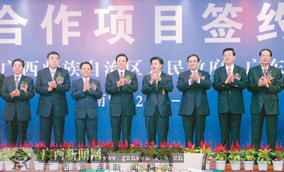 签约仪式由自治区副主席杨道喜主持,广西方领导刘奇葆、陆兵、马庆生、郭声琨、李金早、车荣福、袁凤兰、孙瑜,广东方领导黄华华、李容根,自治区政府秘书长王跃飞、广东省政府秘书长徐尚武等在主席台见证了签约仪式。